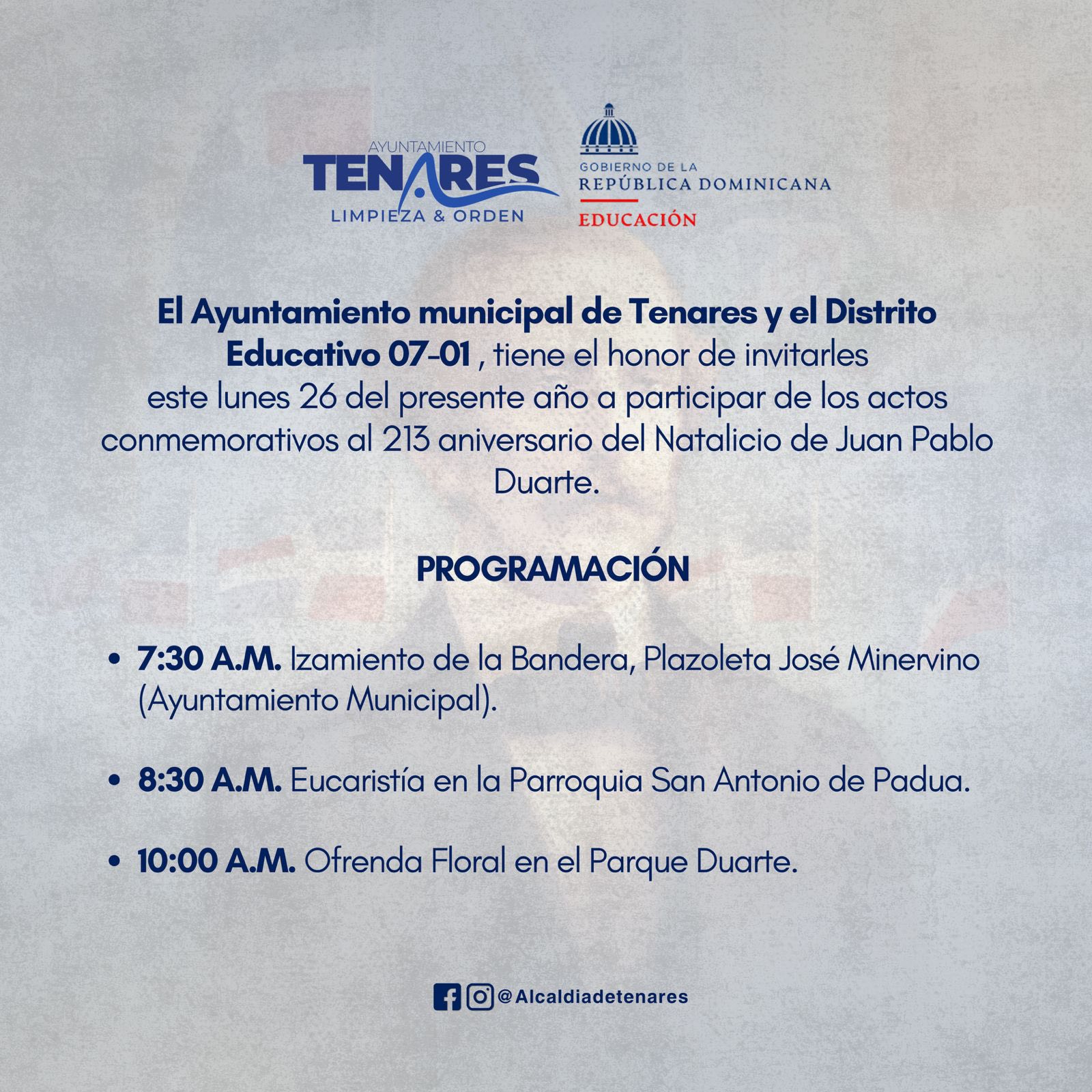 El Ayuntamiento municipal de Tenares y el Distrito Educativo 07-01, tiene el honor de invitarles este lunes 26 del presente año a participar de los actos conmemorativos al 213 aniversario del Natalicio de Juan Pablo Duarte.